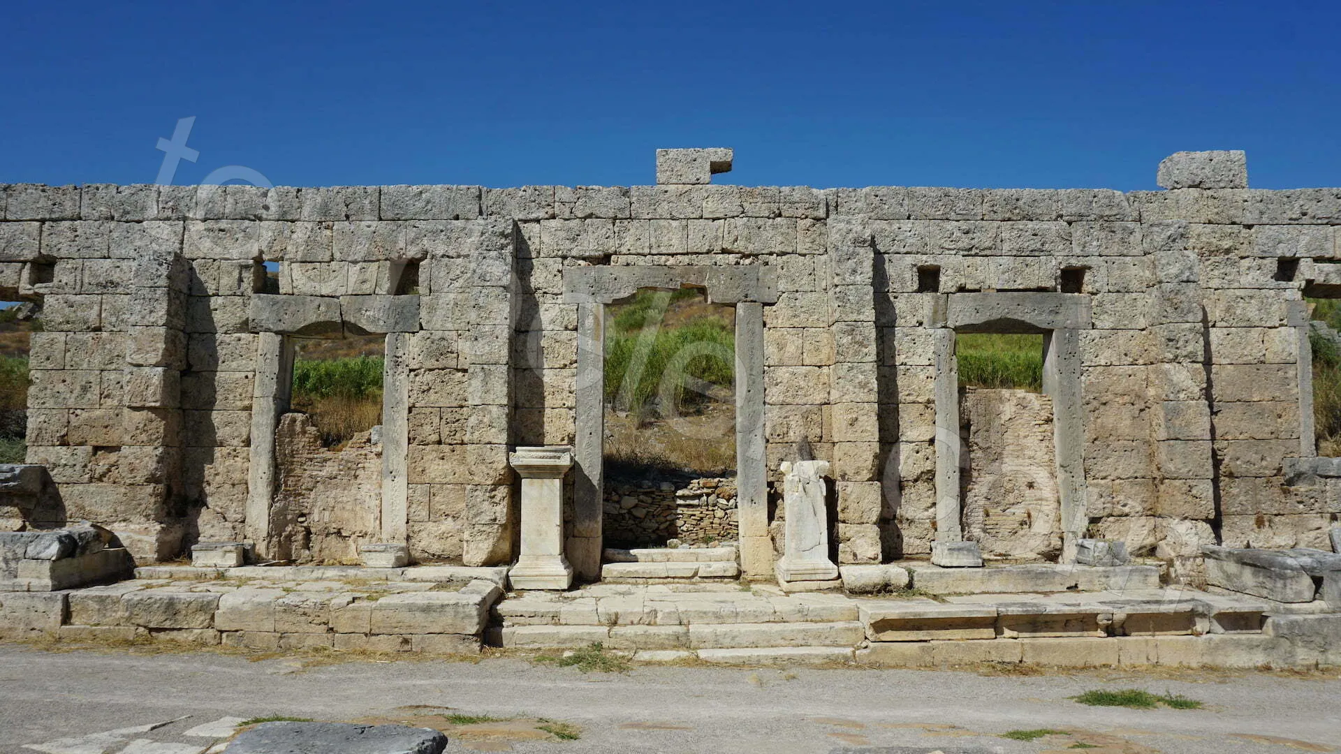 Key structures within the city include the large Roman theatre, agora, baths, the monumental Nymphaeum fountain, colonnaded streets, defensive walls and city gates. The theatre was later repurposed as an open-air place of worship during the Byzantine era, carrying the traces of multiple civilisations in a single building.